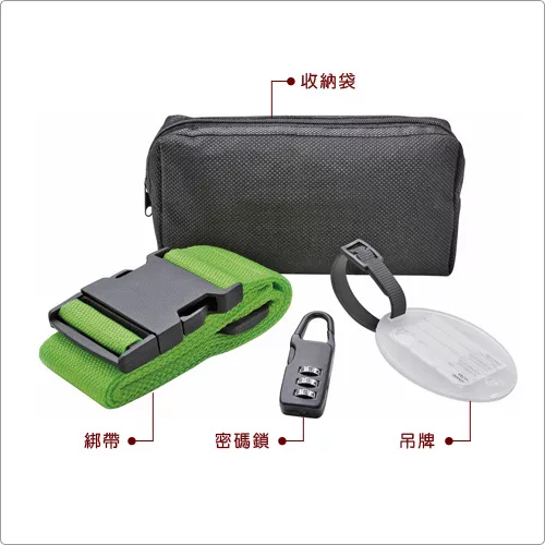 將德國的樸實設計,帶進每日的生活體驗中。一組三入,共三款實用的旅行相關商品,防止您的行李箱被意外開啟。內含固定綁帶(可自由調整長度)、密碼鎖、行李箱掛牌。固定綁帶方便您顧定於行李箱兩側;行李箱掛牌讓您填入個人緊急聯絡資訊;而密碼鎖則提供您最基本的安全保護,是您外出旅行不可缺少的三件必備品。密碼鎖的預設密碼為000。附一收納袋,可將三件物品收納整齊。